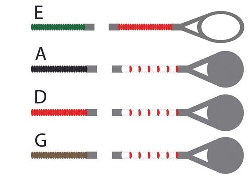 E String: Silvery Steel, Loop End A String: Aluminum wound over a synthetic core D String: Silver wound over a synthetic core G String: Silver wound over a synthetic core